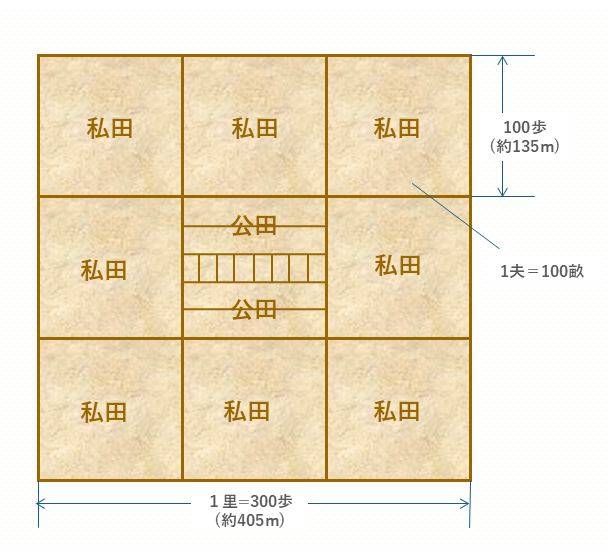 100歩四方の土地を1夫といい、それが9つ集まったものを1井(せい)といいます。これが基本の単位で