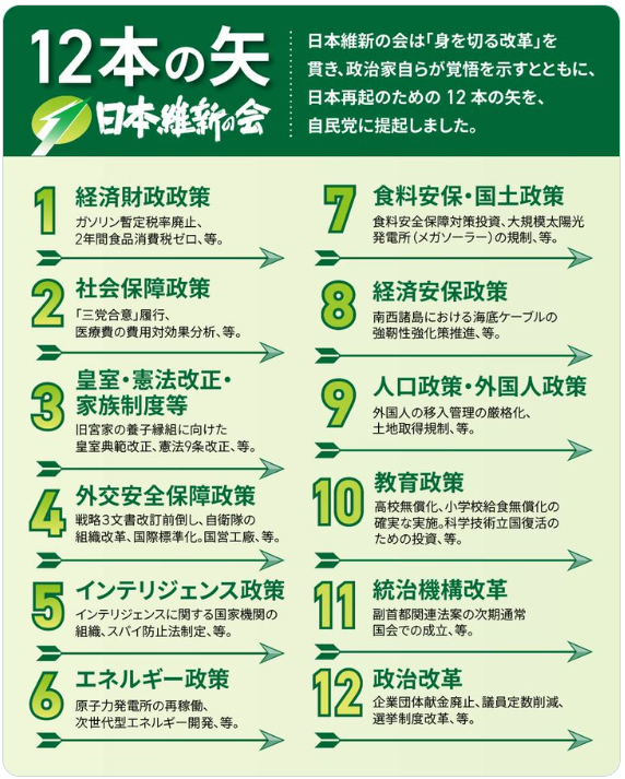 で、どうなることが予想できるかというと、連立を組んだ維新との連立合意文書、いわゆる「12本の矢」ですが、ここに書かれている項目についても、もう自民党だけで2/3とってるんだから「やらなくていいじゃん。」と言い出す輩がぞろぞろ湧いて出てくる懸念があるということです。