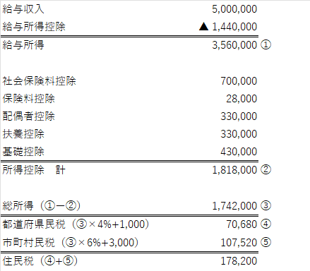 下記に計算例を挙げます。給与収入が500万円で、配偶者1人、子供1人を扶養して、生命保険料を月5,000円、社会保険料を70万円と仮定したとき、住民税は17万8千円となります。